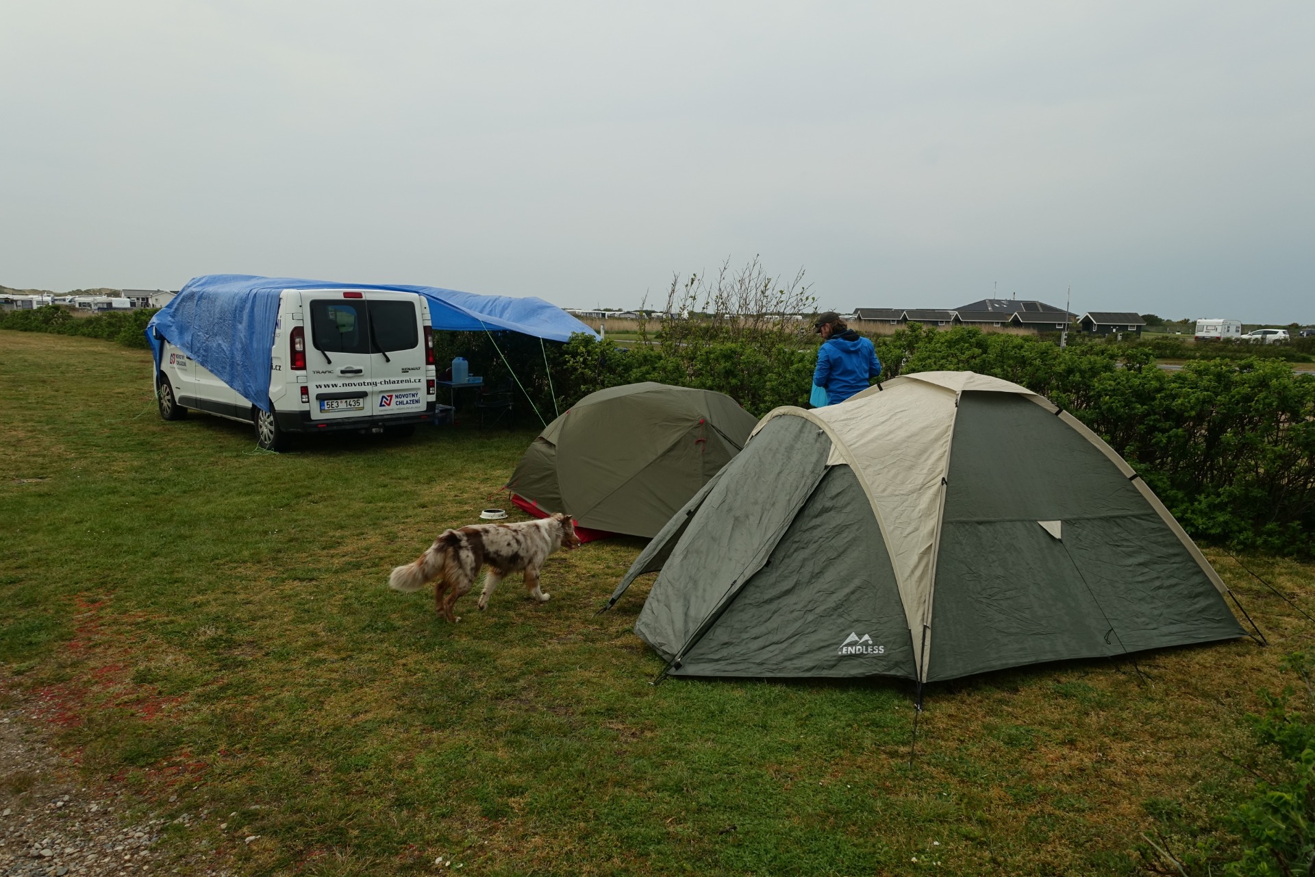 Kilometr od kempu mě chytá vcelku nepříjemný déšť, takže po telefonátu s klukama mě nabírají autem, protože prý už dneska lítat nepůjdou, takže se společně přesunujeme do kempu. Chvíli prší, chvíli ne, chvílemi jen tak mrholí. Naštěstí to není žádná průtrž, takže zvládáme i ohřát první z Martinem předpřipravených a zavařených jídel. Tento způsob se nám velice osvědčil na našich cestách po USA a i tady nás to utvrdilo v tom, že to budem dělat i nadále :) Po nepovedeném pokusu o napnutí plachty mezi auto a zelený porost (ano, stále foukalo) nakonec bereme saky paky a přesunujeme se mimo kemp na parkoviště, kde jsme našli pod střechou takové malé posezení. Krámky nacházející se bezprostředně u toho už jsou naštěstí zavřené. Se psem a alkoholem bohužel nemůžeme pobývat v technické budově v kempu. Ukázalo se to jako správná volba, protože pak celý večer opravdu propršelo. Takže jsme zůstali sušší a ještě jsme si mohli společně posedět a poklábosit. To je lepší, než si povídat přes stan :)