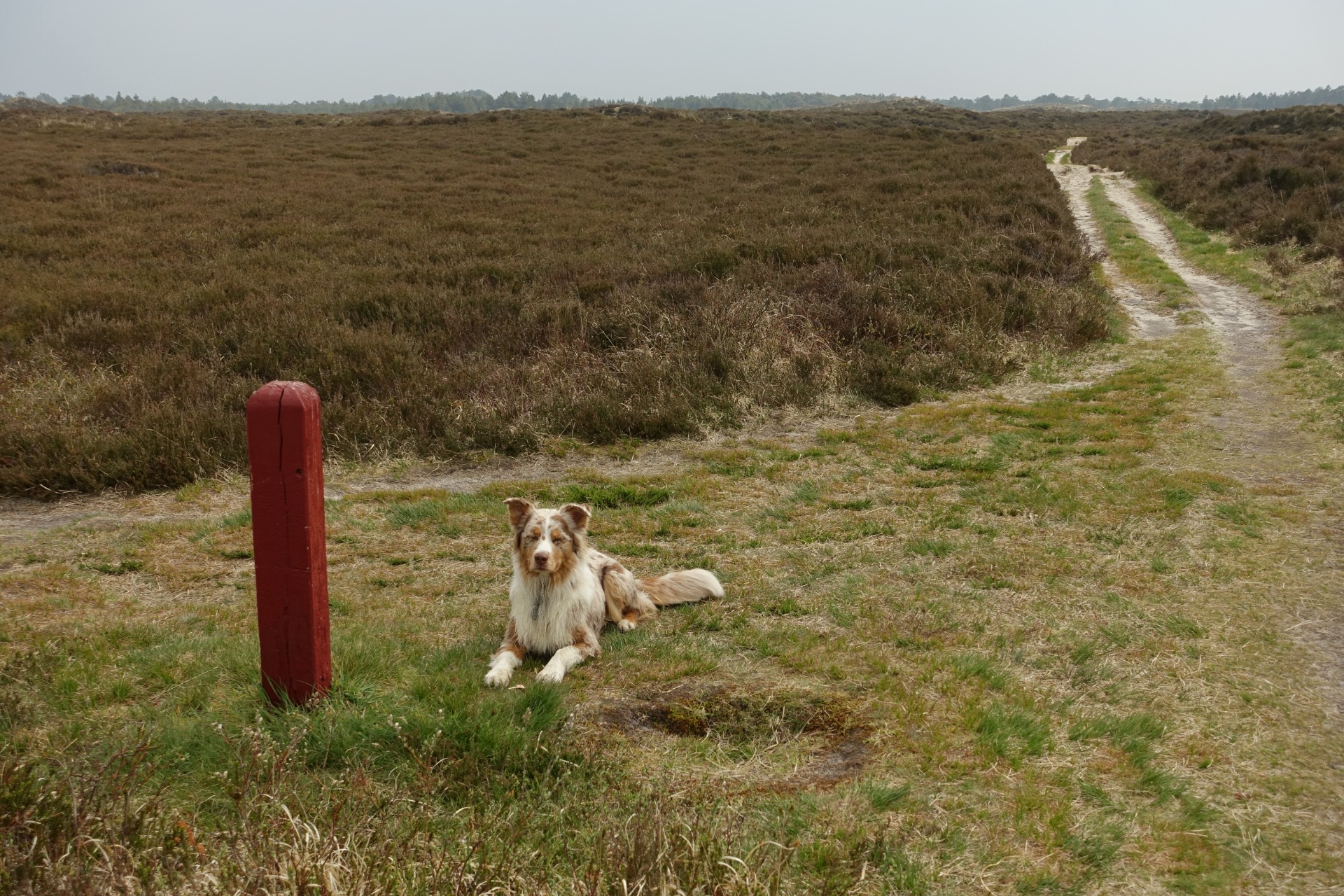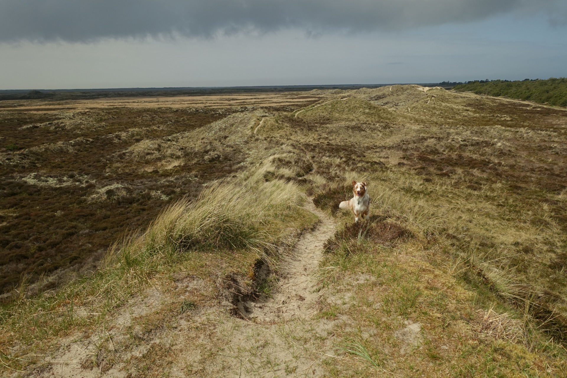 Druhý den jsme vstávali docela pozdě, unavenost se na nás podepsala. Do kempu jsem tedy dorazili až kolem desáté, než jsme si postavili stan, bylo jedenáct a rozhodli jsem, že půjdeme pěšky obhlédnout pláž, která se nacházela hned za kempem a která se stala klukům v následujících čtyřech dnech domovem :) Fouká, od rána naštěstí neprší, všude písek, duny, pláž je úžasná, je dlouhá několik km a široká přes kilometr. Tvrdý písek je samozřejmostí. Kluci na nic moc nečekají, vracíme se tedy do kempu, oni sedají do auta a vyrážejí na pláž lítat. My s Toninou zůstáváme v kempu a já se snažila na chvíli usnout. To mi však Tonina nedovolila, protože sebou ve stanu furt mlela a pochodovala, takže vcelku brzy to vzdávám, beru vodítko a vyrážíme spolu na první procházku po ostrově. Našla jsem nějakou cca 10km trasu, která začíná přímo v kempu.