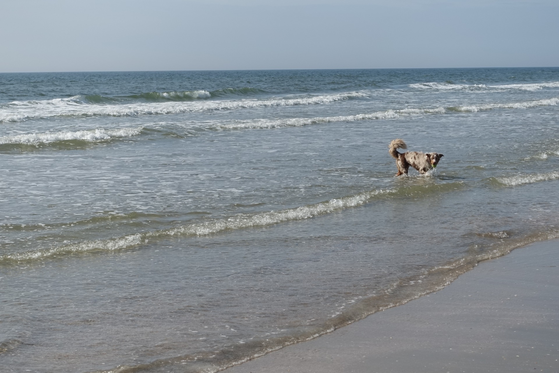 Další den kluci vyrazili dopoledne na vzdálenější pláž, já jsem se proto nechala vyhodit po cestě a 2hodinovou procházkou jsem pak za nimi přišla. Po cestě jsme s Tončou dobily jeden z nejvyšších vrcholů ostrova, který měřil úctyhodných 19 m. n. m. Více tady fouká a nashromáždilo se zde více písku :) Po prvním dni už jsem si zvykla na trochu jinou přírodu, ale stále je co obdivovat. Tonča je ve svém živlu, hlavně že je tady skoro na každém kilometru nějaké jezírko nebo mokřad, takže je takřka neustále ve vodě :) Kluci s touto pláží nebyli moc spokojeni, bylo tam totiž docela mokro - je přílivová, takže ji čas od času zaplaví mořská voda, narozdíl od té pláže u kempu. Martinovi by to snad ani nevadilo, ale Ondra to má na tom boardu blbé. Ihned po mém příchodu mi hlásili újmy na zdraví - Martin si pochroumal prst u ruky a Ondra ošklivě spadl na koleno. Proto to taky zabalili a přesunuli jsme se zpět k našemu kempu. Jelikož se udělala nádherně, kluci se rozhodli, že ještě půjdou jezdit na "jejich" pláž. Vyrazila jsem tedy s nimi a šla s Tončou k moři. I když už jsme ji nechali v moři koupat včera, dnes jsem měla více času a jelikož jsem s sebou měla i balonek, házela jsem jí ho do vln, to jí moc bavilo.