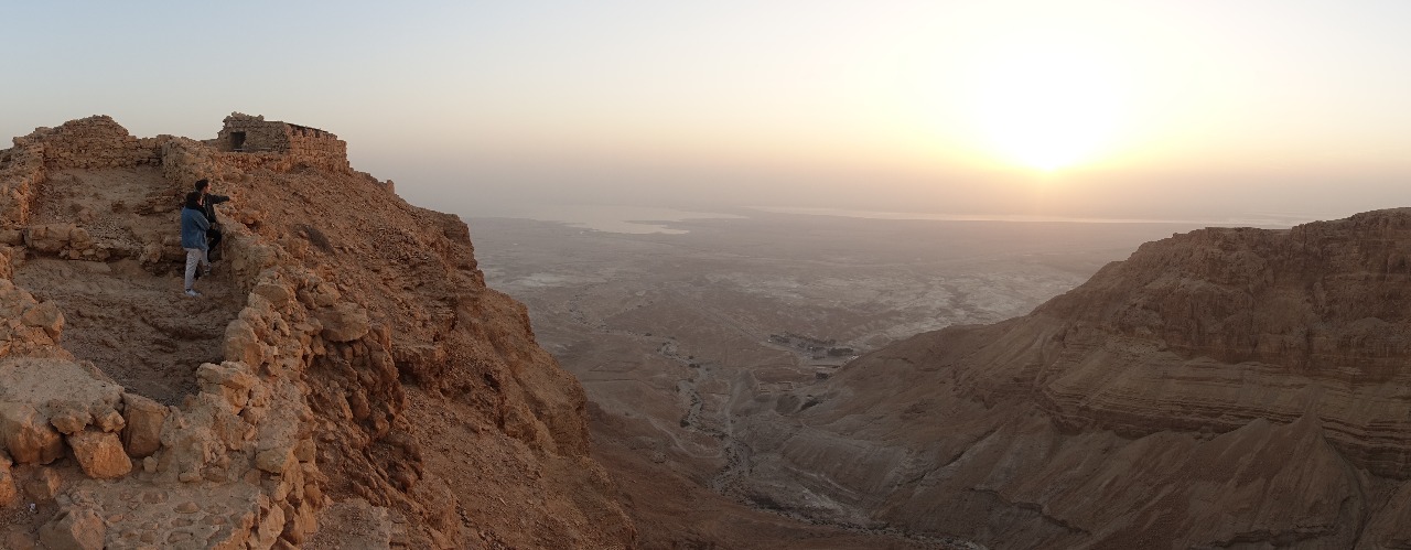 Internety a jiné zdroje avízují, že cesta pěšky nahoru trvá od 50 minut do 90 minut, dolů pak 30 - 40. My to dáváme s přehledem za 50, takže jsme nahoře ještě půl hodinu před svítáním. To byla člověk ani nepoznal, neboť od 6 hodin bylo v okolí tolik světla, jakoby už Slunce na obzoru bylo. Takže jak jsem s těšili na stoupání ve světle čelovek, nic z toho se nestalo, neboť bylo po celou dobu pod nohy vidět úplně bez problémů. Jelikož jsme nahoře byli s předstihem, trochu jsem to tam prošmajdali (i když spoustu věcí bylo v rekonstrukci) a stihli i dostat spucunk od místních za sezení na zídce. Lidí tam bylo přehršel. Až nás to překvapilo. Východ jsme nafotili a vyrazili na cestu dolů. U auta jsme byli po 30 minutách. Překvapilo nás, že zpátky v hotelu jsme byli v 8 ráno. V tuhle dobu bychom asi ani normálně nevstávali! Co teď? Báli jsme se, že nestihneme snídani, ale v tomhle případě jsem stihli poválet se na pokoji, dát si čaj/kafe na pokoji, přestrojit se a jít se koupat na pláž do Mrtvého moře, vrátit se, sbalit se a jít na pozdní snídani (podávala se až do 13:00, takže ideálně jít ráno na snídani a pak ještě na oběd :)), kterou jsem si užívali dosytosti přes hodinu.