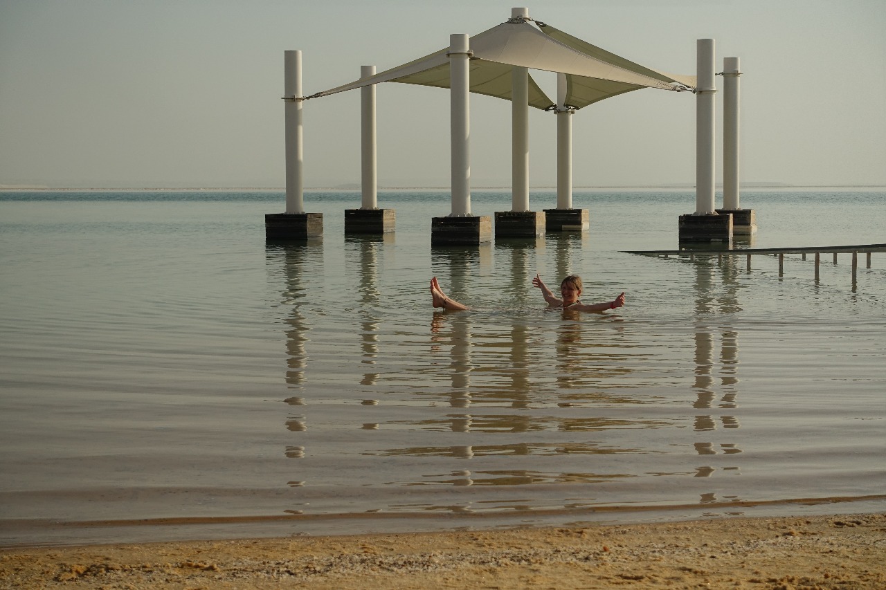 Tohle ubytování se fakt vyplatilo, stálo sice 1200 Kč na osobu (a stalo se tak moji nejdražší zaplacenou nocí v mém životě), ale v ceně bylo wellness a snídaně. Nemluvě o bezplatném stání. Jinde nás ubytko stálo sice 800 Kč, ale bylo dost prosté a bez jídla, natož s wellness. Takže doporučuji vychytat na Bookingu v hotelu Oasis Hotel Spa akci. My jsme měli navíc štěstí, že nás ubytovali ve vedlejším spřáteleném hotelu, který byl údajně lepší. Pláže v tuto dobu zely prázdnotou a voda, musím uznat, nebyla úplně nejteplejší, rozhodně studenější, než jsem čekala. Ale to mě neodradilo od toho, abych se tam na pár minut namočila a alespoň nasbírala několik solných kuliček, které se tvořily už několik metrů od pláže. Opravdu zajímavý úkaz! Není se čemu divit, v litru vody v Mrtvém moři je totiž rozpuštěno 33 gramů soli, tu hustotu můžete doslova cítit a hlavně i vidět! Nesnažte se ale vodu ochutnat jako já, je to opravdu velice nedobré a pachuť z toho vám pak navíc zůstane v ústech nějakou dobu...